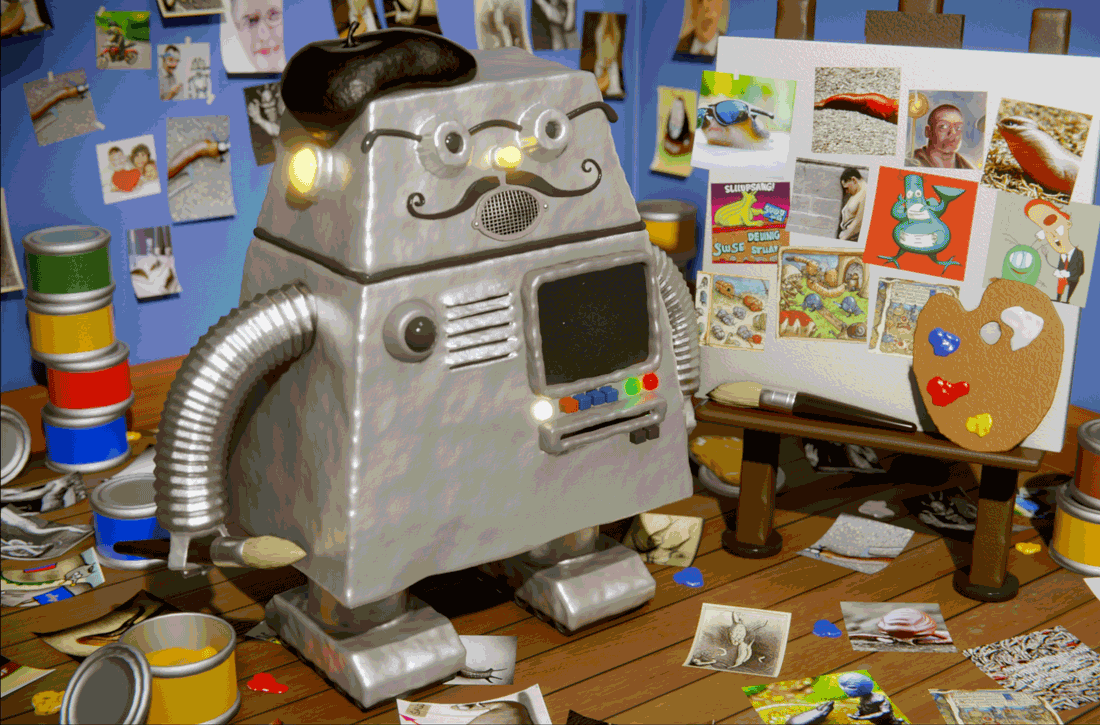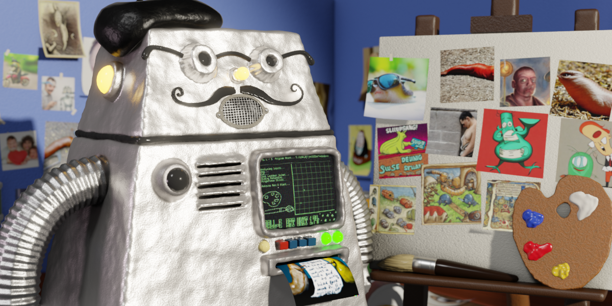 This Illustration of a chaotic, efficient, prolific, A.I. powered robot artist was created to accompany an article entitled ‘No, Artists and Designers Aren’t About to Lose Their Jobs to AI’